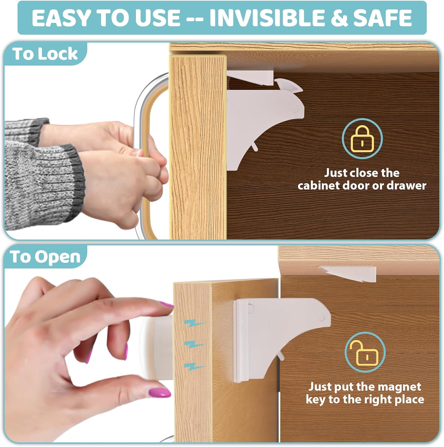 Our SafeNest™ Magnetic Cabinet Locks are designed to protect babies, toddlers, and even mischievous pets from accessing drawers and cabinets containing cleaning supplies, sharp objects, or fragile items — all without bulky exterior straps or drilling holes.